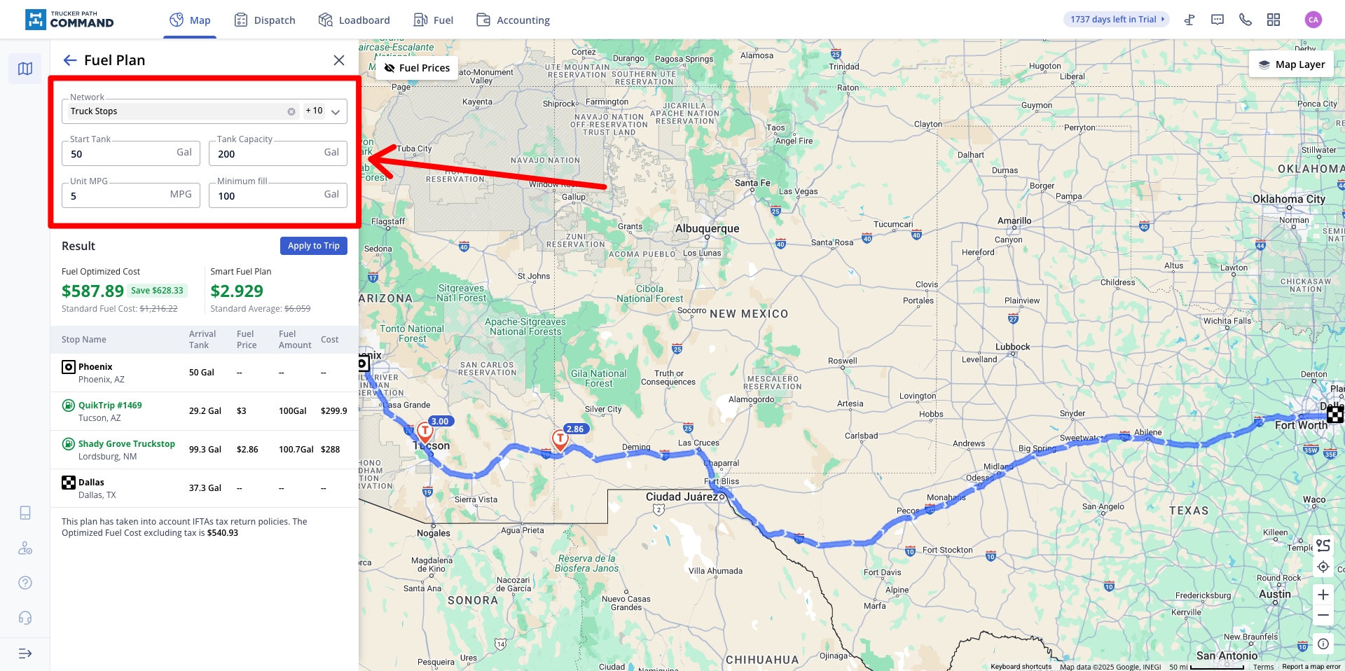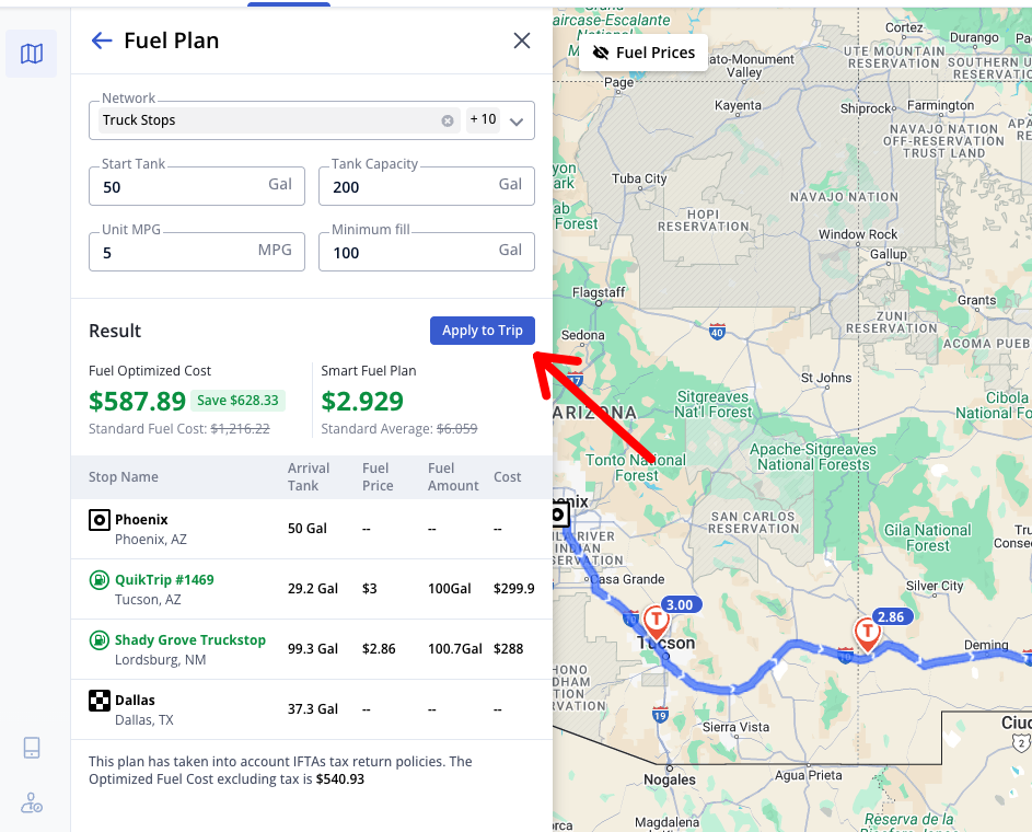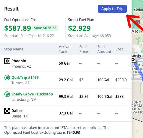 You can then click apply to trip and that will add all of those fuel stops into the driver's route and itinerary.
