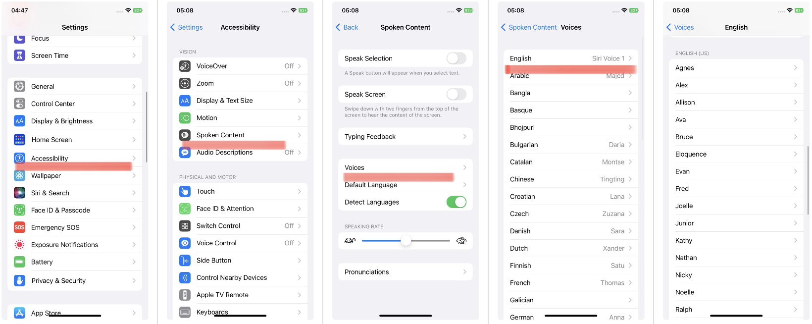 | Settings --> Accessibility --> Spoken Content --> Voice --> English --> Voice Skin |