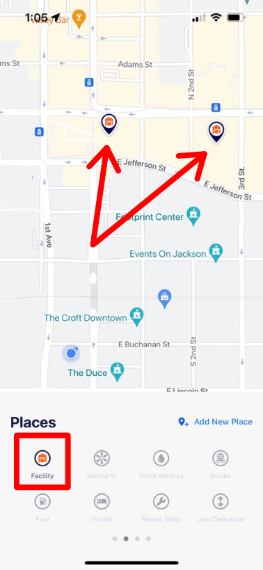 From there you can select which POIs you want to view on the screen. Once selected, the POIs will become visible on the map and you can click on them for more information about each location. This includes thinks like: Truck Entrance, Hours, Address, as well as amenities. You can swipe up to view more details.